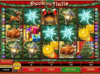 Игровой автомат Deck the Halls создаст праздничное настроение. Виртуальными помощниками Санты на этот раз будут не эльфы, а Вайлд и Скаттер. Ими стали лого игры и медные колокольчики, которые украшают каждую новогоднюю елку или входную дверь. Вайлд заменяет любой символ и удваивает выплаты, если удалось создать выигрышную комбинацию. Скаттеры, появляясь на последних трех барабанах, активируют десять фриспинов с удвоенными выплатами.