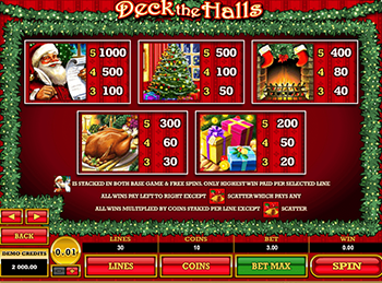 Демо slot Deck the Halls – игровой аппарат о любимом ежегодном зимнем празднике. Эмулятор предлагает геймерам отпраздновать рождество вместе и посмотреть, какие подарки уготовлены азартным игрокам. Символикой стали изображения самого Санты, пышной нарядной елки, камина, рождественской индейки и манящих подарков.