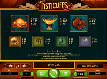 Опытным игрокам нравится играть на реальные деньги с выводом в автоматы Вулкан благодаря рекордному рейтингу заведения. В коллекции официального сайта находится азартная игра Fisticuffs, предназначенная для новичков и слотхантеров. Над созданием автомата Кулачный Бой трудились программисты компании-разработчика Netent, использующие инновационную графику для отображение спортивных поединков.