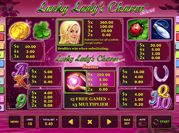 Все гемблеры, которые начинают играть в слоты, мечтают о том, чтобы удача широко улыбнулась им. А игровой автомат Lucky Lady’s Charm Deluxe будто специально создан для того, чтобы приманивать удачу. Дело в том, что он посвящен милой блондинке, которая окружила себя разнообразными атрибутами, которые согласно существующим поверьям способствуют везению. К примеру, здесь можно заметить счастливую монетку, кроличью лапку, четырехлистный клевер и многие другие подобные предметы. А очаровательная девушка загадочно улыбается, ведь она наверняка знает все секреты удачной игры.