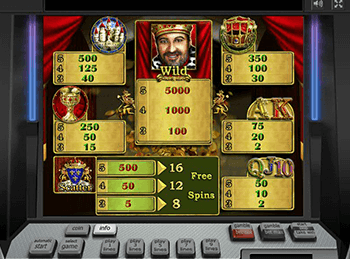 Редчайшая слот-машина обладает такой символикой, как роскошные средневековые замки с башенками и цифровые обозначения, золотые чаши и кареты, гербы и портреты мудрого правителя. Изображение короля – Вайлд, а за пятерку упомянутых перед этим картинок симулятор позволит заработать тысячи и тысячи – аж к 5 000 жетонов.